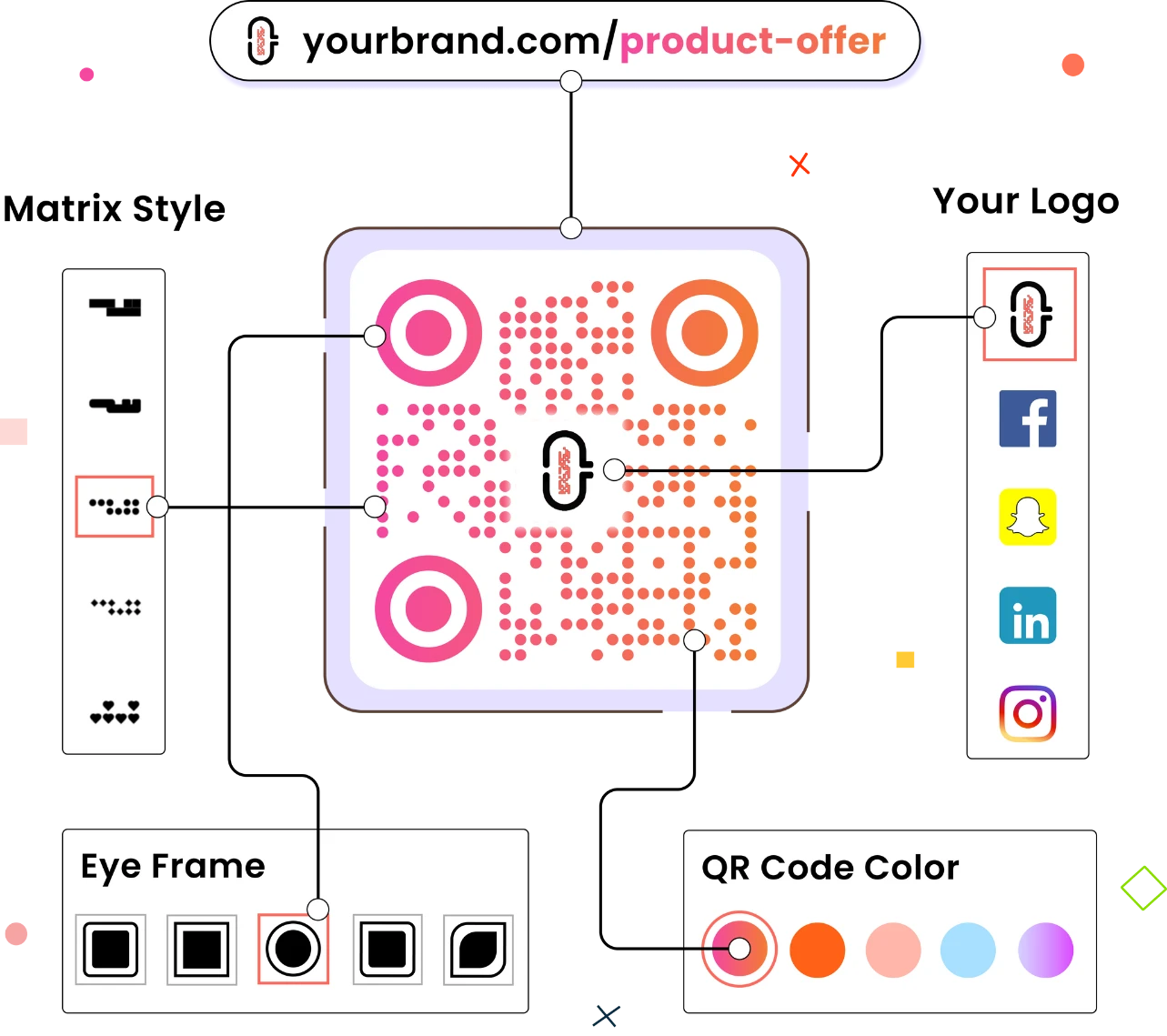 - Customize QR codes with your own logo, brand colors, and unique eye frames.
