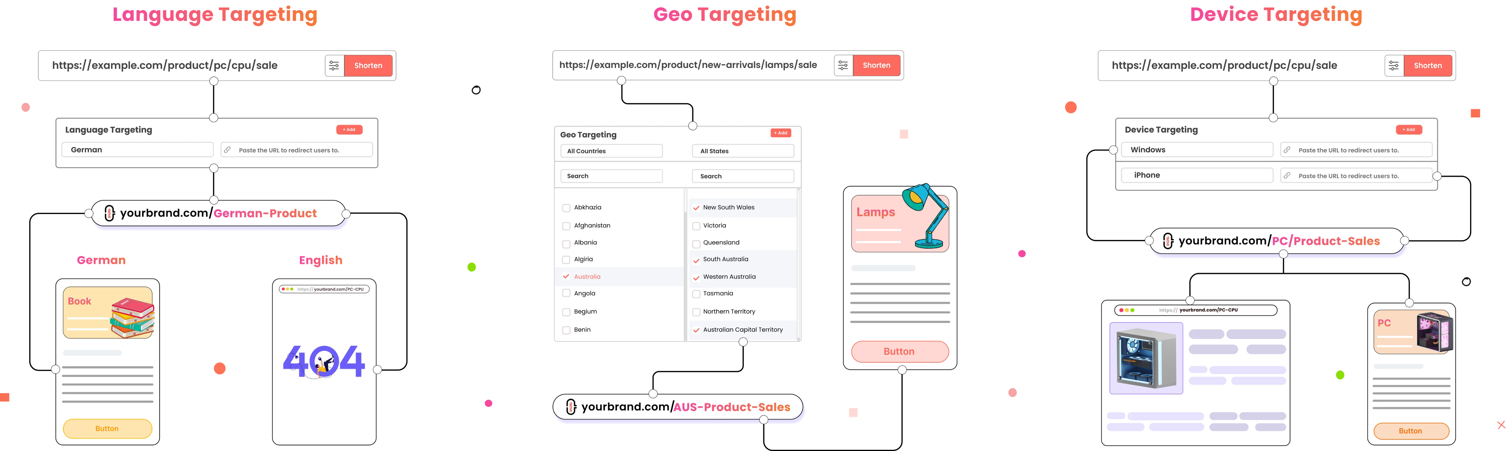 Reach your audience with relevant content by customizing links based on their location, device, or language preferences.